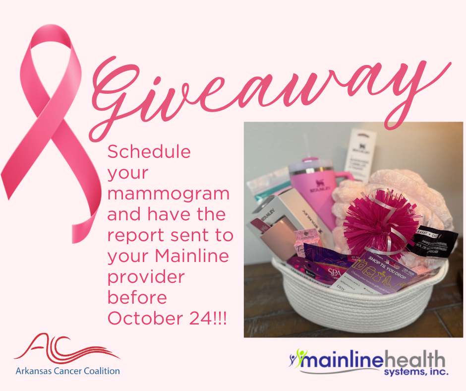 Don't forget to schedule your screening mammogram as soon as possible and be entered to win our Pink Gift Basket Giveaway if your provider recieves your report before October 24!